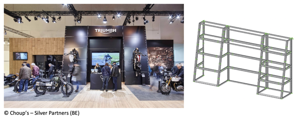 Voor de Triumph stand op het Autosalon 2019 te Brussel (BE), werkte standenbouwer Choup’s – Silver Partners deze strakke beursstand uit. Het meest uit het oog springende gedeelte van de stand bestaat voor een deel uit op maat gemaakt trapezium kaders. Een mooi voorbeeld om te illustreren dat met hoofdzakelijk standaard kaders en enkele specials toch een buitengewoon resultaat behaald kan worden.