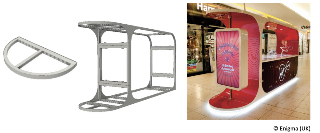 Standenbouwer Enigma creëerde voor Virgin Media een nieuwe generatie kiosks. De schets werd vertaald naar een structurele 3D tekening, waarbij quasi alle kaders standaard voorzien konden worden. Enkel voor de halve bogen boven- en onderaan de kiosk werd een speciaal kader gemaakt om zo het gewenste resultaat te bekomen.