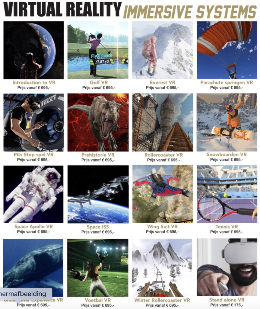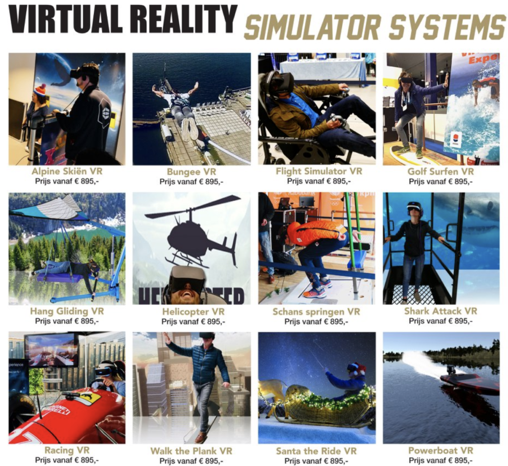 Door constant te innoveren en ontwikkelen is Action Events inmiddels uitgegroeid tot de grootste leverancier van de Benelux als het om Virtual Reality entertainment systemen gaat. Dat laat zich vooral zien door het ruime aanbod aan titels en simulators. Zo kan je een parachutesprong maken terwijl je eigenlijk op een beursstand staat, een ruimte reis maken terwijl je eigenlijk gewoon op een bedrijfsfeest bent of in een originele Formule 1 auto plaatsnemen om te ervaren wat Max Verstappen meemaakt tijdens een race.